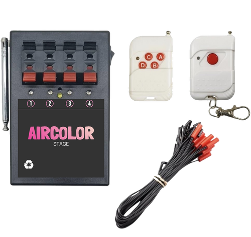 Aircolor fonctionne uniquement avec un déclenchement électrique. Le produit se branche à l’Aircomand grâce au câble fourni, puis il suffit d’appuyer sur un bouton pour déclencher l’effet au moment souhaité. Il n’y a pas de déclenchement manuel possible sans ce boîtier.